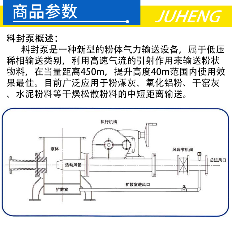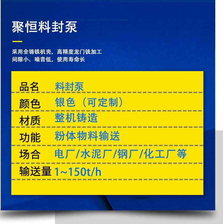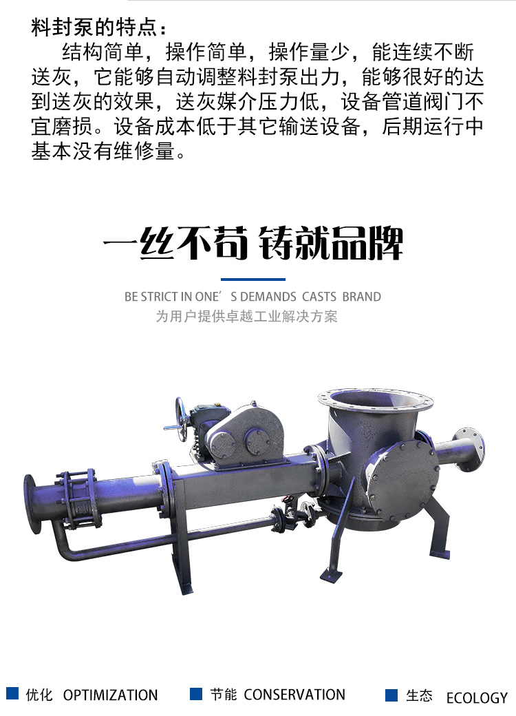 該設備自投放市場以來經多家使用證明該泵與倉式泵、斗式提升機等設備相比,具有體積小,風壓低(0.2--1大氣壓,一般不需空壓機,只配羅茨 風機即可)、易布置、無揚塵、符合環保要求等一系列優點。廣泛用于 電力、建材、化工等領域,是在當量距離680m,高度50m內用來提升輸送水泥、生料、粉煤灰等粉狀物料的理想設備,該料封泵主要特點是使用壽命長、運轉可靠,幾乎沒有維修量和磨損件