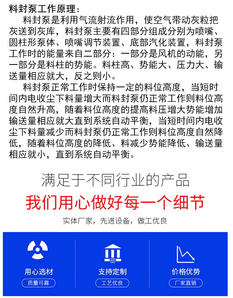 料封泵是利用氣流射流作用,使空氣帶動灰粒把灰送到灰庫,料封泵主要有四部分組成分別為噴嘴、圓柱形泵體、噴嘴調節裝置、底部汽化裝置,料封泵工作時的能量來自二部分:一部分是風機的動能,另一部分是料柱的勢能。料柱高、勢能大、壓力大、輸送量相應就大,反之則小。